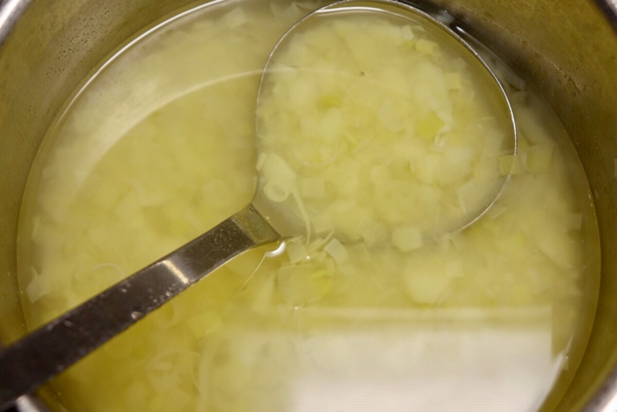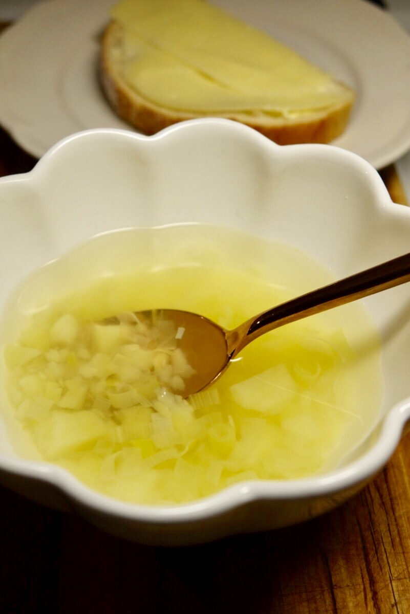Skala potatisarna och dela i mindre bitar, lägg dem i vatten och låt koka upp tillsammans med en buljongtärning alternativt fond. Skär ett långtgående snitt i din purjolök och skölj ur den innan du skär bitar och lägger ner i soppan. Låt koka tills potatisen är riktigt mjuk, då kan man antingen äta den som den är, eller så brukar jag pressa sönder potatisbitarna lite slarvigt.