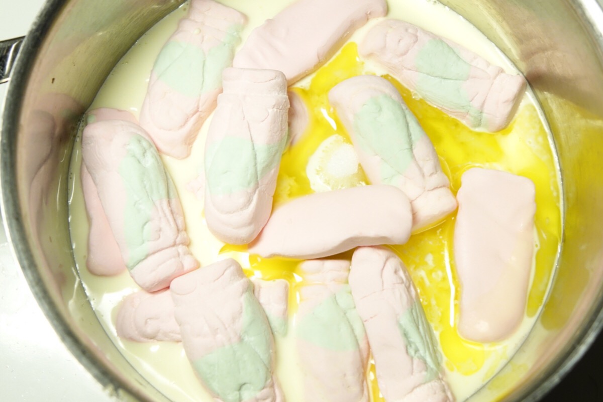 Börja med att ta fram en form, smöra den eller lägg dit ett bakplåtspapper. Blanda allt utom chokladen i en kastrull och sätt på spisen. Låt koka tills tomtarna smält och allt blivit en smet. Hacka under tiden chokladen i mindre bitar. Häll ner chokladen och rör runt så chokladen smälter och blandas med resten.