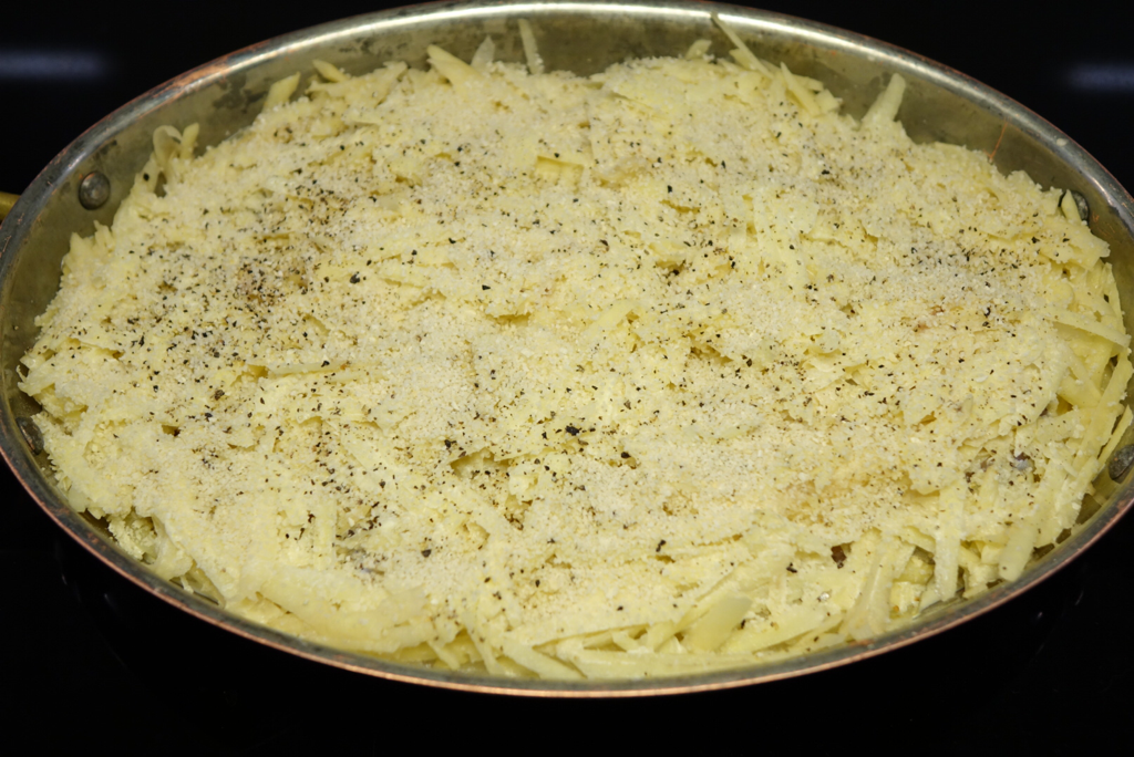 Börja med att sätta ugnen på 200 grader (eller 175 grader varmluft). Ta fram en ugnsform och börja riva potatisen på den grövsta rivjärnet. Min sambo Daniel provade också att rullhyvla potatisen med en rullhyvlingsapparat som han köpte till mig i våras, när han var till New York.