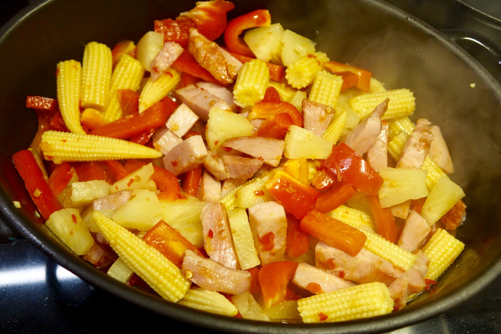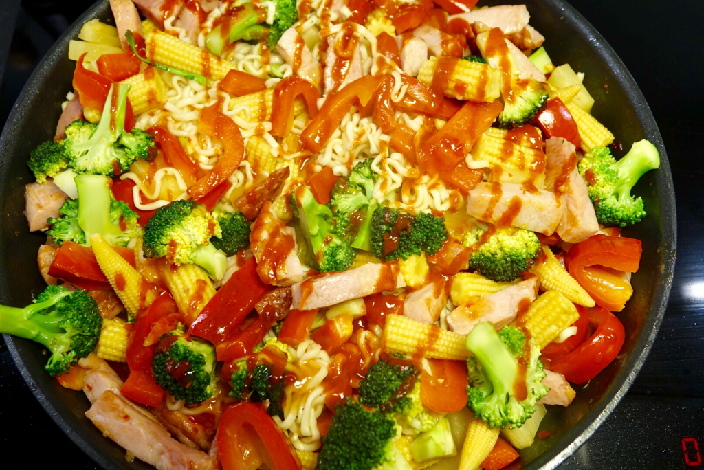 Strimla kasslern och fräs på i stekpanna eller wokpanna tillsammans med strimlad paprika, minimajs och ananasbitar. Slå på sweet chilisås och spadet från ananasen. Låt fräsa ihop tills allt fått en karamelliserad, glansig yta. Vänd ner nudlar och broccoli. Smaksätt med sriracha-sås alternativt vanlig chili.