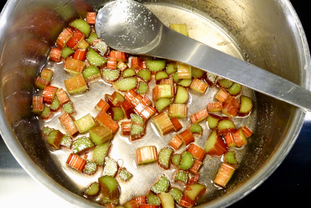 Lägg rabarber, citronsaft och strösocker i en kastrull. Koka upp tills rabarbern mjuknat och sockerkristallerna smält. Sila bort vätskan (återanvänd vätskan till fil/gröt dagen efter). Här kokade jag lite för länge, så de smala rabarberbitarna föll sönder, nästan till en sylt. Så det blev inte så snygga bitar, även om de blev goda!