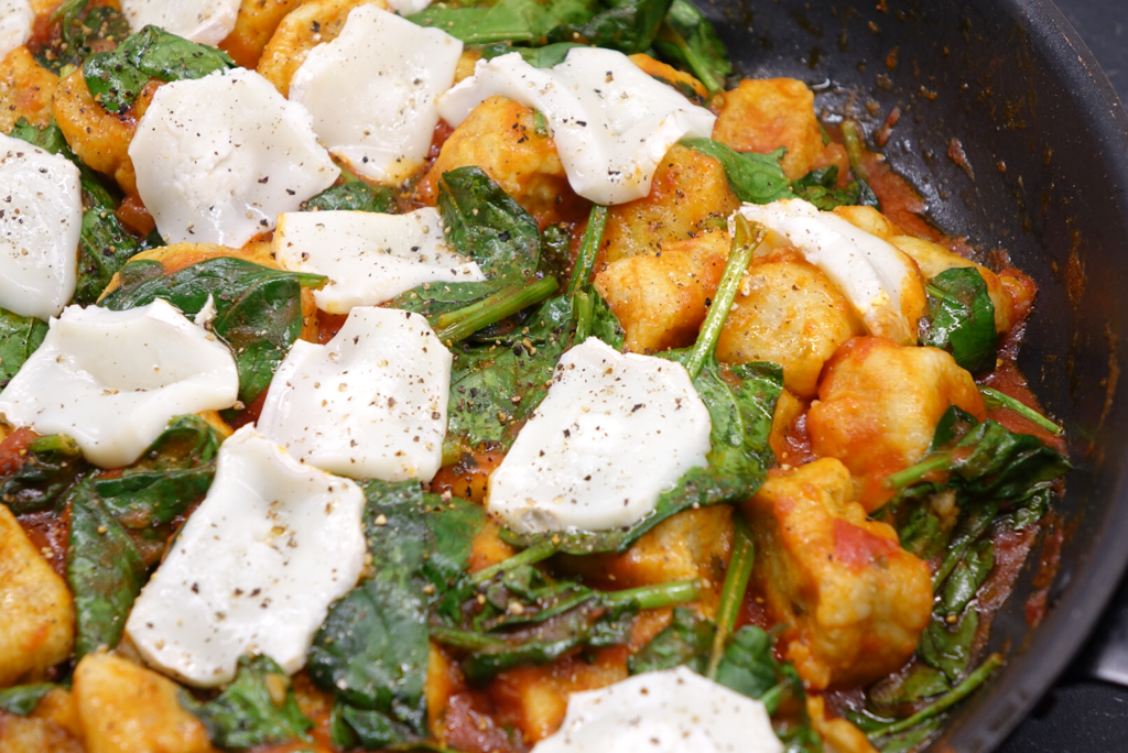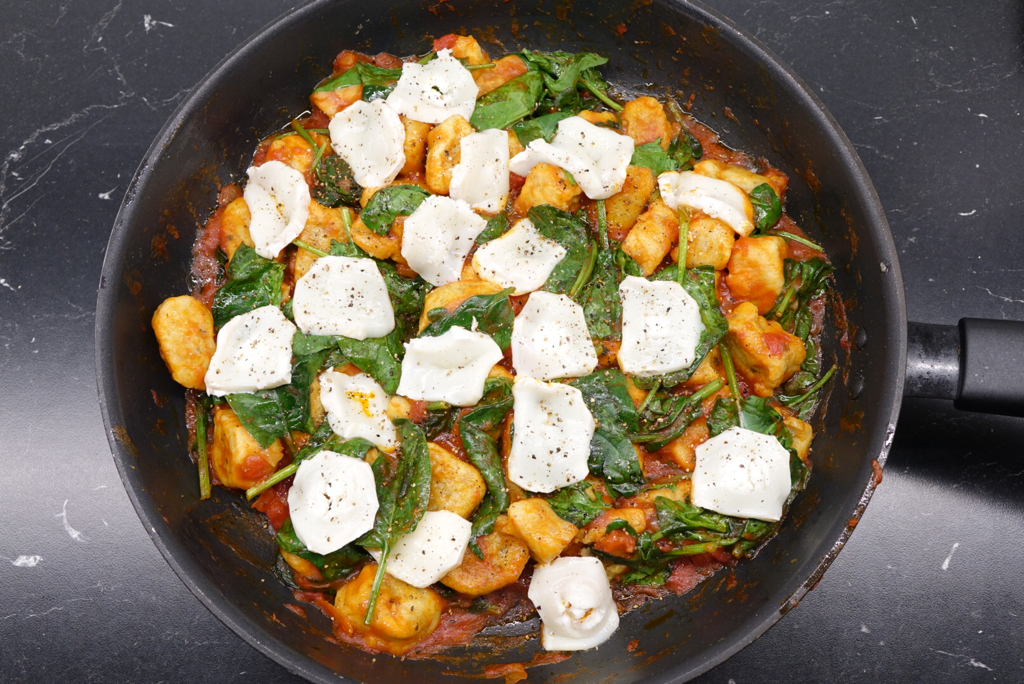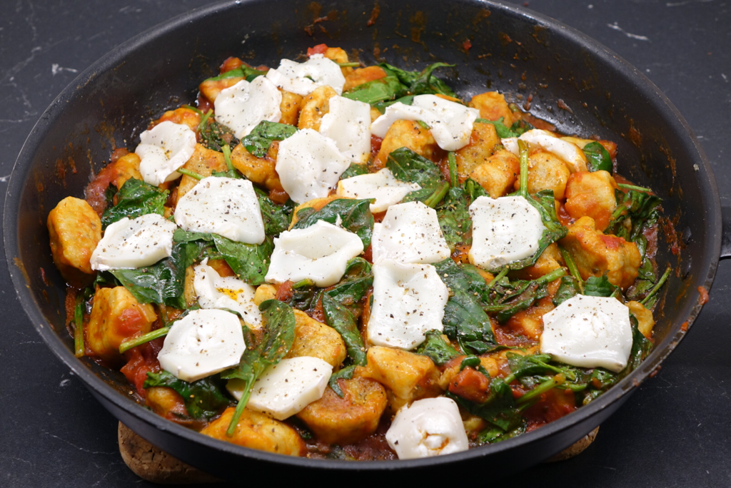 När dina gnocchis fått lite stekyta, så lägg på färsk spenat och låt den bli varm och sjunka ner. Lägg ev på mera spenat. Fyll på med varm tomatsås och smaksätt med salt och peppar. Strax innan servering så kan du smula/skära bitar av chèvre högst upp. Låt osten smälta en aning och ställ fram hela pannan på bordet.