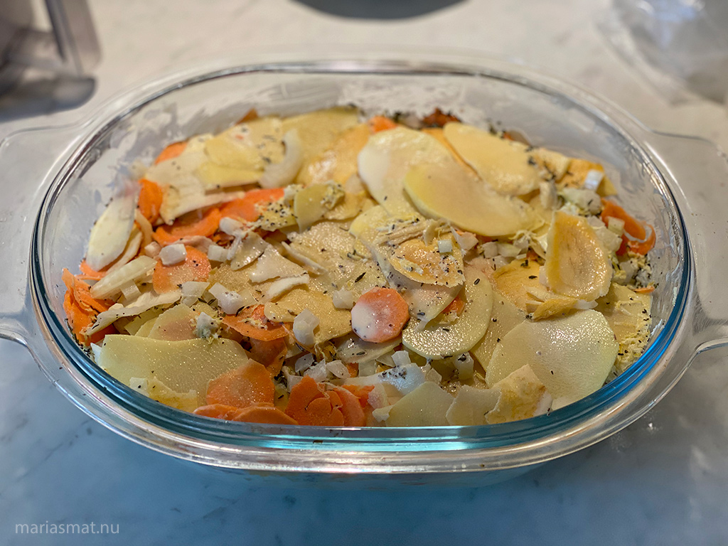 Börja med rotfrukterna samt lök. Skala potatis, palsternacka, kålrot och motrötter. Skär i skivor (enklast i en matberedare med skärkniv, då blir alla skivor lika tjocka). Hacka löken. Varva alla skivor och lök i en stor smord ugnsform.