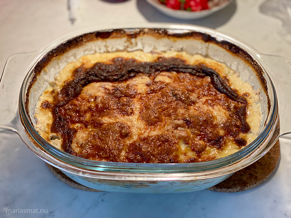 Riv ost och bred ut över gratängen, samt skiva en mozzarellaost och lägg ut i ett jämnt lager. Ställ in gratängformen i ugnen och låt stå tills gratängen är klar, ca 45-60 min.