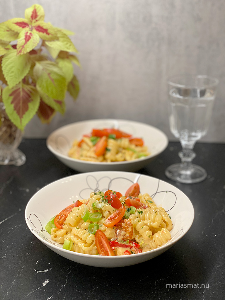 Lägg upp på tallrikar och garnera med resternade tomathalvor samt skivad salladslök. Gott gott!