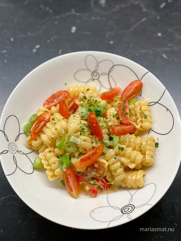Börja med att sätta igång en pastakastrull och skära din grillost i mindre bitar. Hacka din schalottenlök, vitlök och dela tomaterna i mindre bitar. Stek osten först så den får en yta. Ta upp och lägg åt sidan. Fortsätt att fräsa den hackade löken och även hälften av tomaterna.