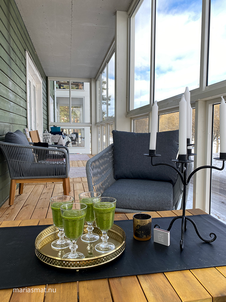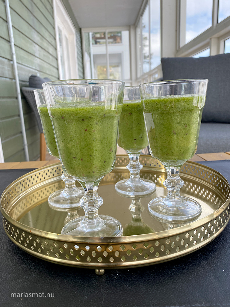 Mixa tills allt är finfördelat och sen mixar du en liten stund till. Jag ogillar ifall jag vill dricka min smoothie och så finns det bitar kvar. Häll upp i snygga glas och ställ ev in i kylen tills det är dags för servering – eller drick direkt. Det är lite godare när smoothien är kall, men den funkar alldeles utmärkt rumstempererad också.