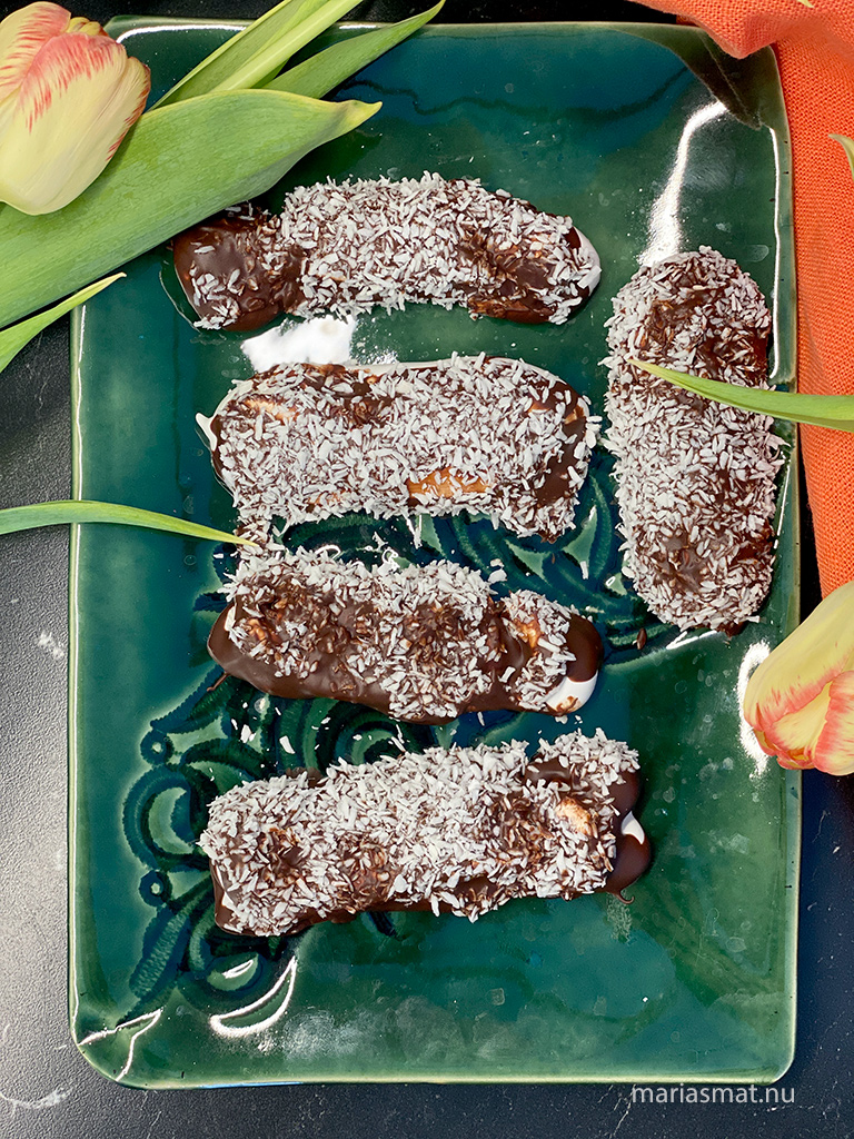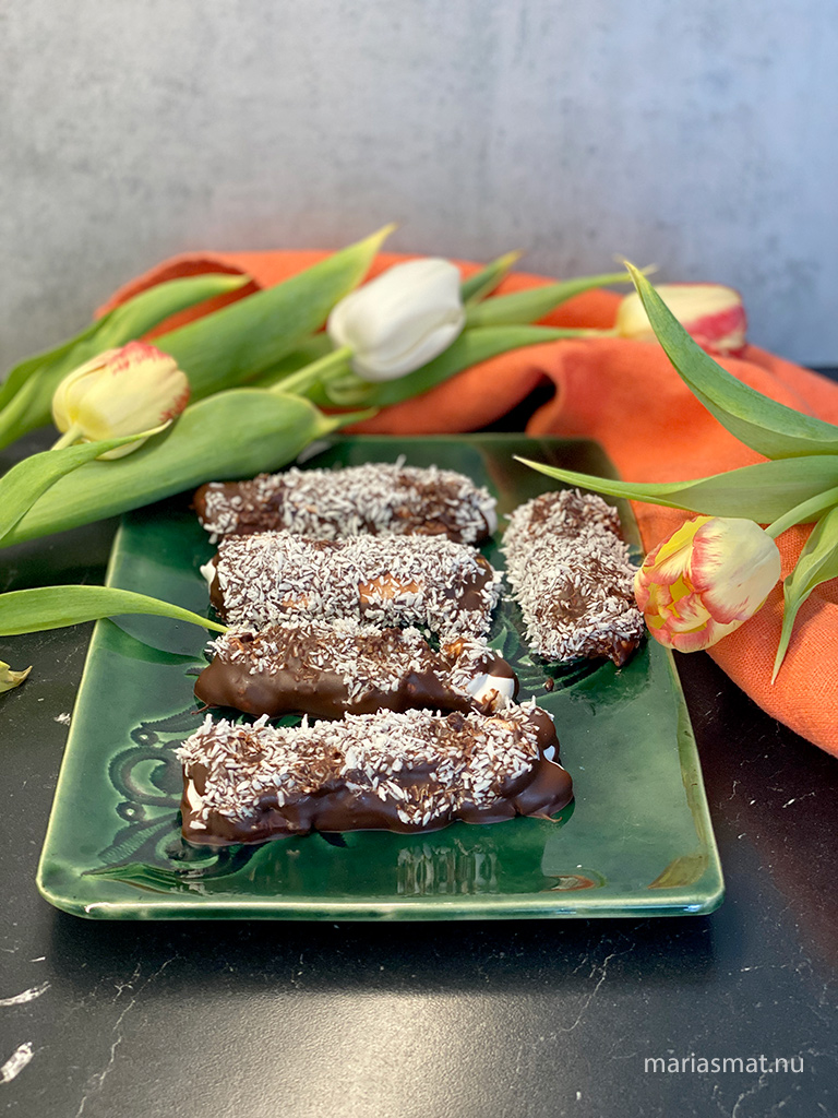 Låt chokladen svalna något innan du doppar skumraketerna i den mörka chokladen och sedan rullar dem i kokos medan chokladen fortfarande inte har stelnat. Detta är en kladdig historia så strunta i om de hamnar lite skumraketsbitar, smält choklad eller kokos där det egentligen inte ska vara. Slutresultatet påverkas inte så mycket av det.
