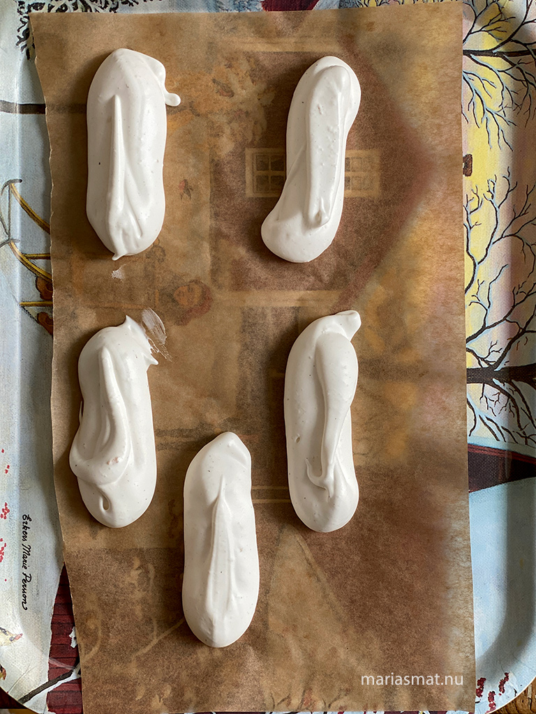 Täck två plåtar med bakplåtspapper. Spritsa ut skumsmeten i cylindrar som är ca 3-4 cm breda och 6-8 cm långa (egentligen spelar storleken här ingen roll men det var så stora jag gjorde dem för att få ut 25 stycken skumrakter).
