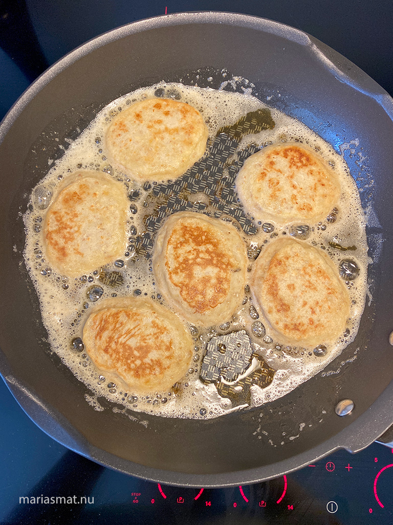 Sätt igång en stekpanna och ta i Smör & Rapsolja. Klicka ut små plättar och stek på båda sidorna. Servera dina bananplättar tillsammans med sirap och gärna blåbär (jag tog ut ur frysen i samband med att jag började laga, så hann de tina hyfsat innan mellanmålet serverades).
