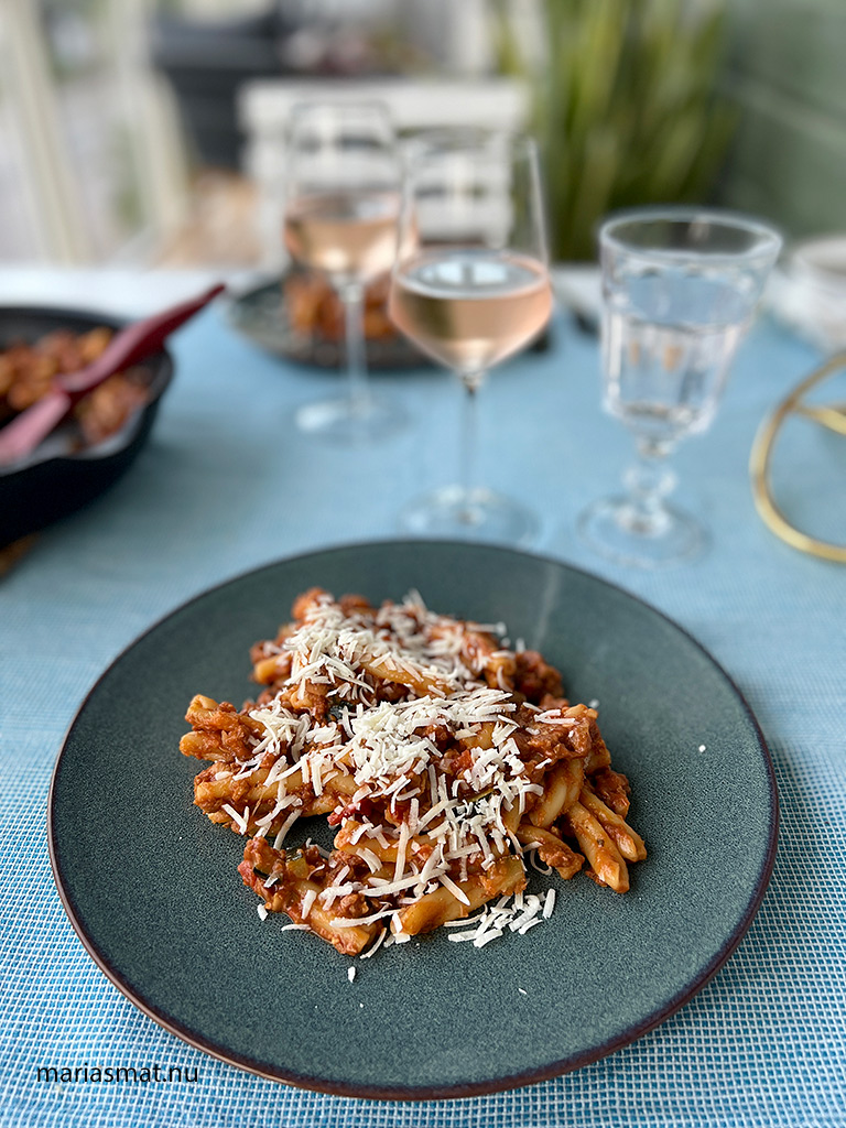 Igår var det måndag kväll och vi hade varit borta över helgen, så det ekade tomt i kylskåpet. Men jag var inte så pigg på att svänga förbi någon butik heller. Så det blev att hitta på något på det som fanns hemma helt enkelt. Det resulterade i en god vegetarisk färssås med svamp, serverad med pasta och ett glas vin. Lagat lite på en höft på det vi hade hemma.