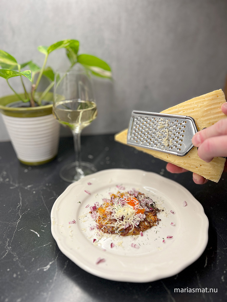 Toppa dina rårakor med Västerbottensost med en klick creme fraiche, finhackad rödlök, valfri rom, hackad dill och finriven Västerbottensost. Servera med något gott i glasen och ha en skön lördagskväll.