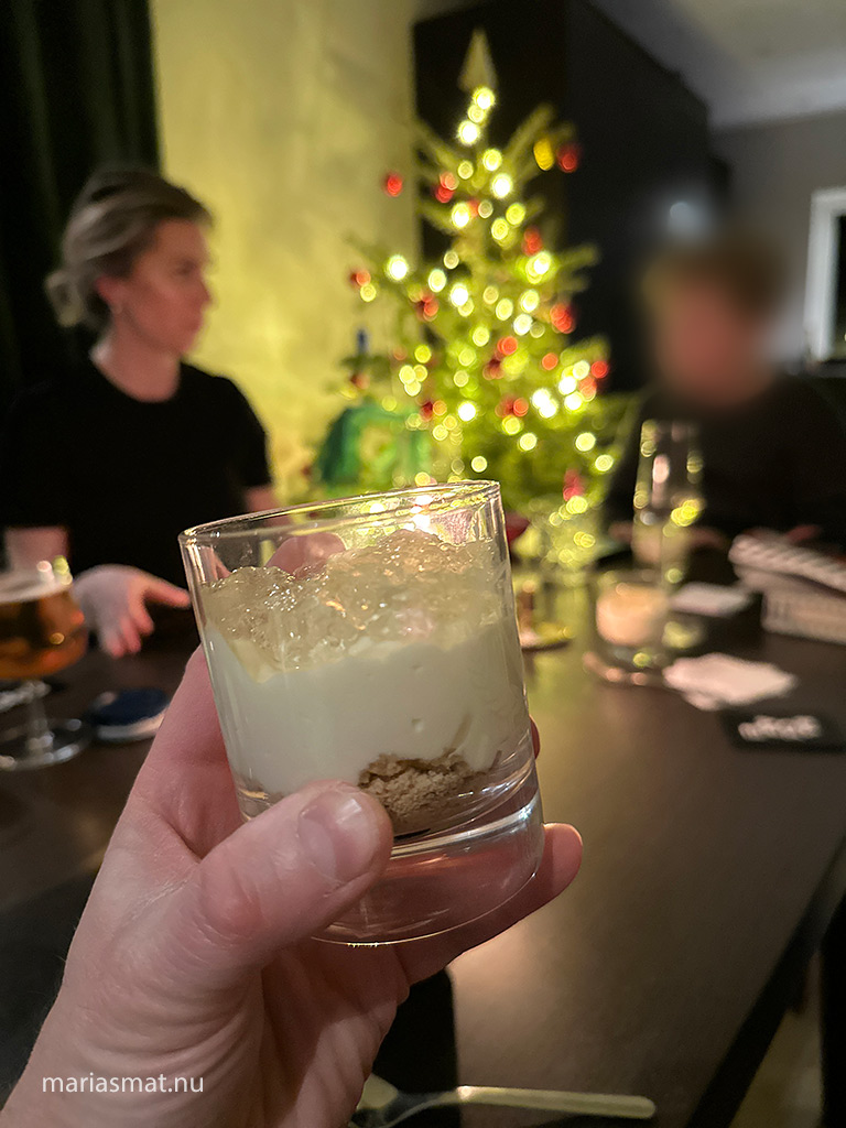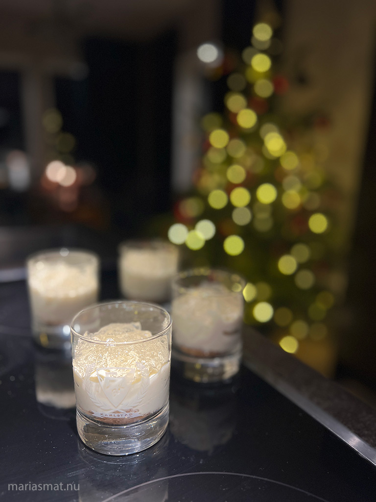 En perfekt efterrätt då det mesta går att förbereda. Jag hade proseccogelén i ett eget fat kvar att pynta med, resten var klart. Så efter lite pynt så kunde jag servera. Receptet är beräknat för fyra personer men jag tyckte att det blev lagom för sex personer. Oftast vill man inte ha så mycket utan mest bara något litet sött.