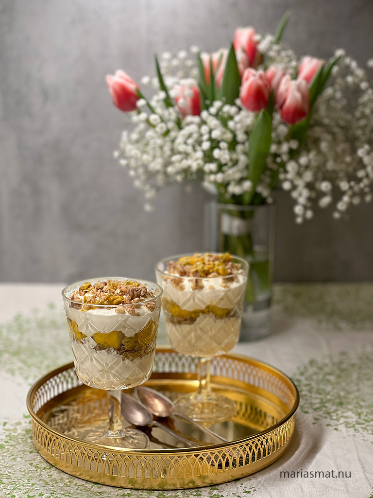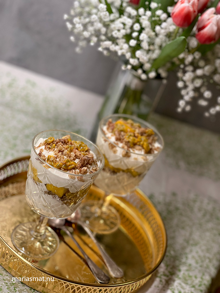 Ta fram snygga glas och lägg vaniljkräm i botten. Lägg på ett lager crunch, mango i mindre bitar och delar av passionsfrukten. Lägg på mera vaniljkräm och toppa till sist med crunch och resterande passionsfrukt. Servera din snygga efterrätt till valfri middag!