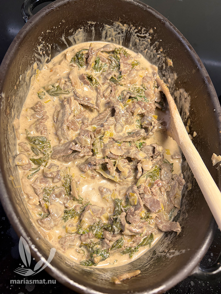 Fortsätt med hackad lök och vitlök, fräs i stekpannan. Ta även i om du gillar grönkål, paprika eller svamp. Häll på vitt vin och låt koka en kort stund. Fortsätt med vatten och köttbuljongtärning samt grädde och senap. Låt puttra och lägg ner köttet sista minuterna.