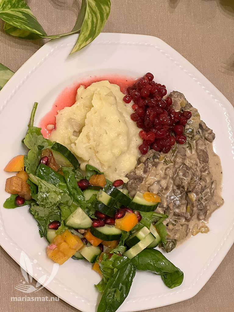 Servera strimlad lövbiff i senapssås tillsammans med potatismos, rårörda lingon och en god sallad. Lördagsmiddagen är klar!