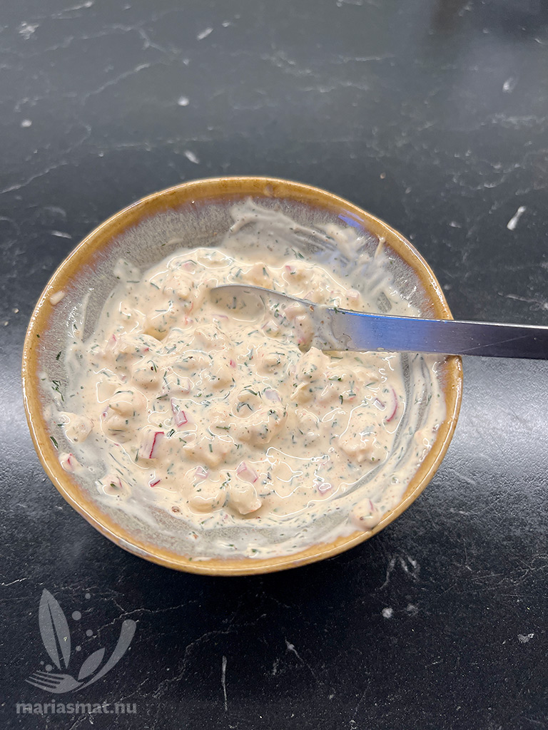 Börja med röran. Blanda ihop grovhackade räkor tillsammans med majonnäs och lite rökt paprika. Fortsätt med finhackad rödlök och citron, både zest och saft. Smaka av med salt & peppar så du får en god smak!