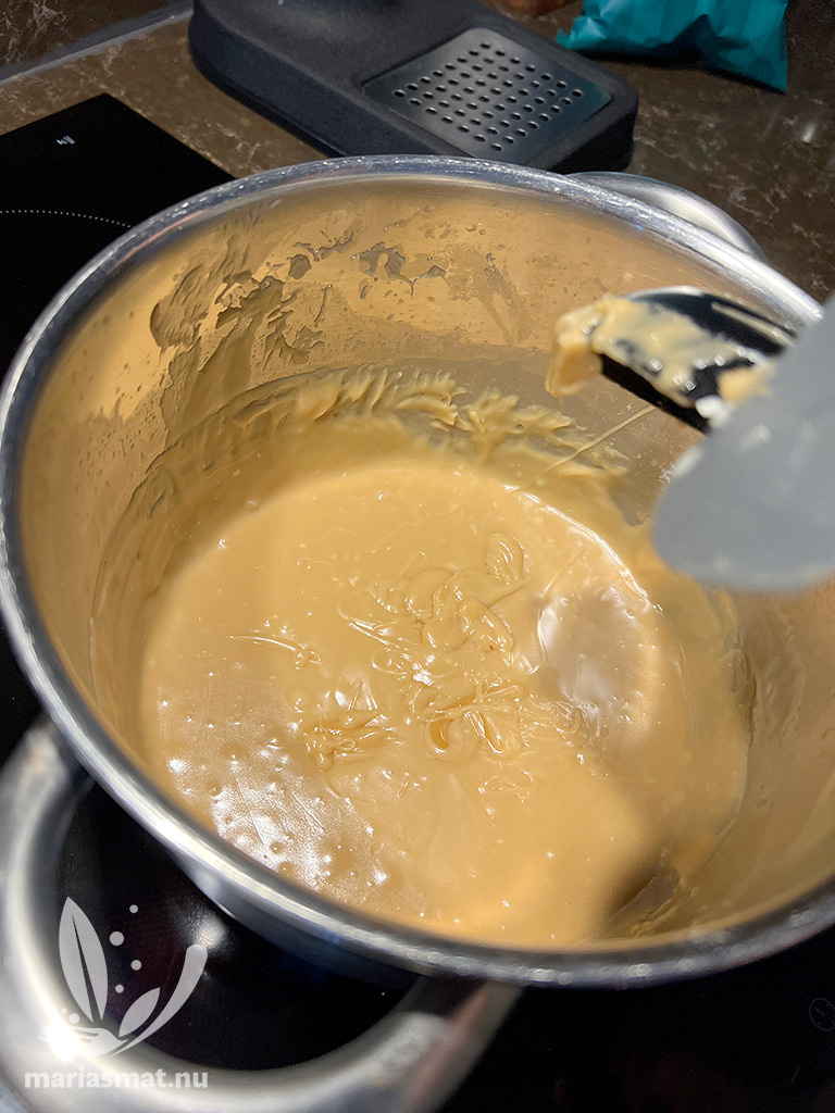 När kolasmeten är 122 grader lägger du först ner smöret och låter det smälta in under omrörning. Ta kastrullen av plattan och tillsätt chokladen. Rör till en homogen smet och häll ut i en ugnsform med bakplåtspapper.