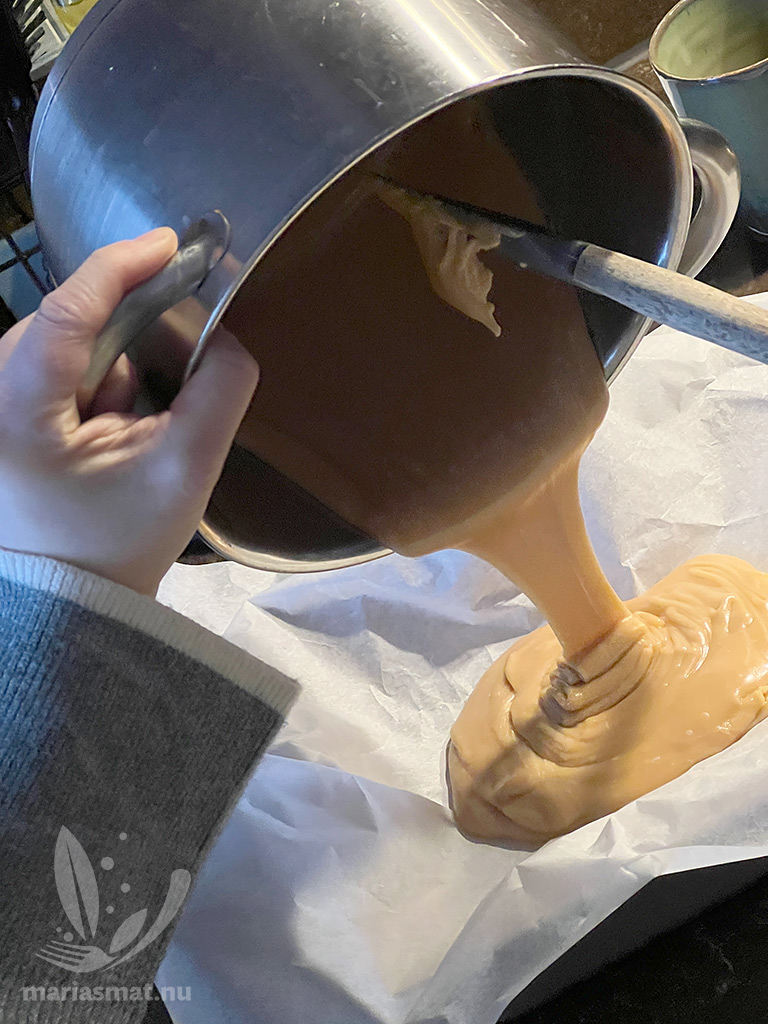 Mät upp strösocker, grädde och sirap i en kastrull. Låt koka tills smeten är 122 grader, rör då och då. Under tiden hinner du dela smöret i mindre bitar och hacka chokladen.