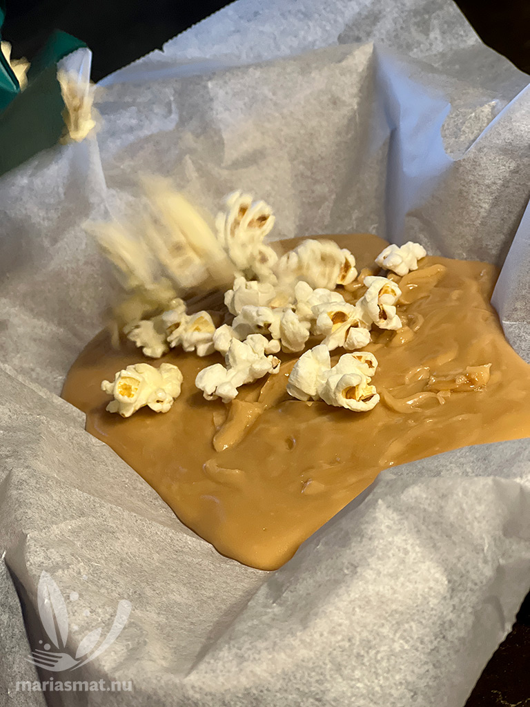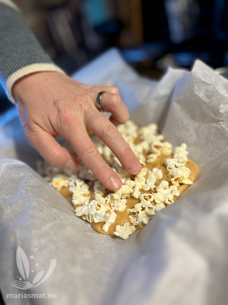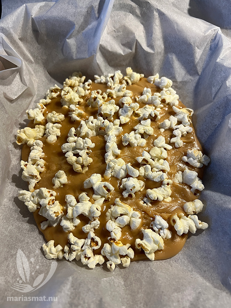Strö ut poppade popcorn ovanpå din fudgesmet och tryck ner dem en aning i smeten. Låt smeten stelna och skär sedan lagom stora bitar och ställ ut på årets gottebord.