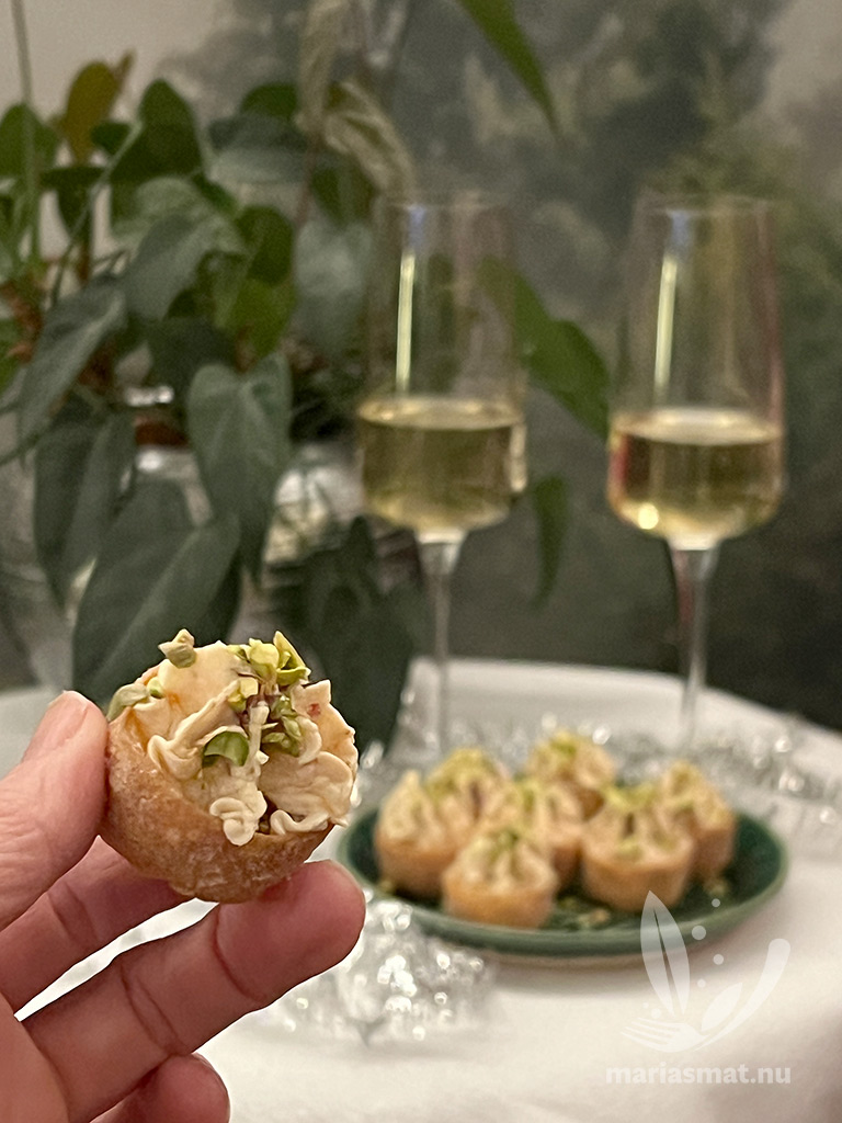 Hacka soltorkade tomater och blanda i ostblandningen. Ställ kallt tills det är dags för servering (du kan till och med lägga ner röran i en spritspåse, som du ställer i ett glas och ställer kallt). Du kan också hacka pistagenötterna, så är det mesta förberett.
