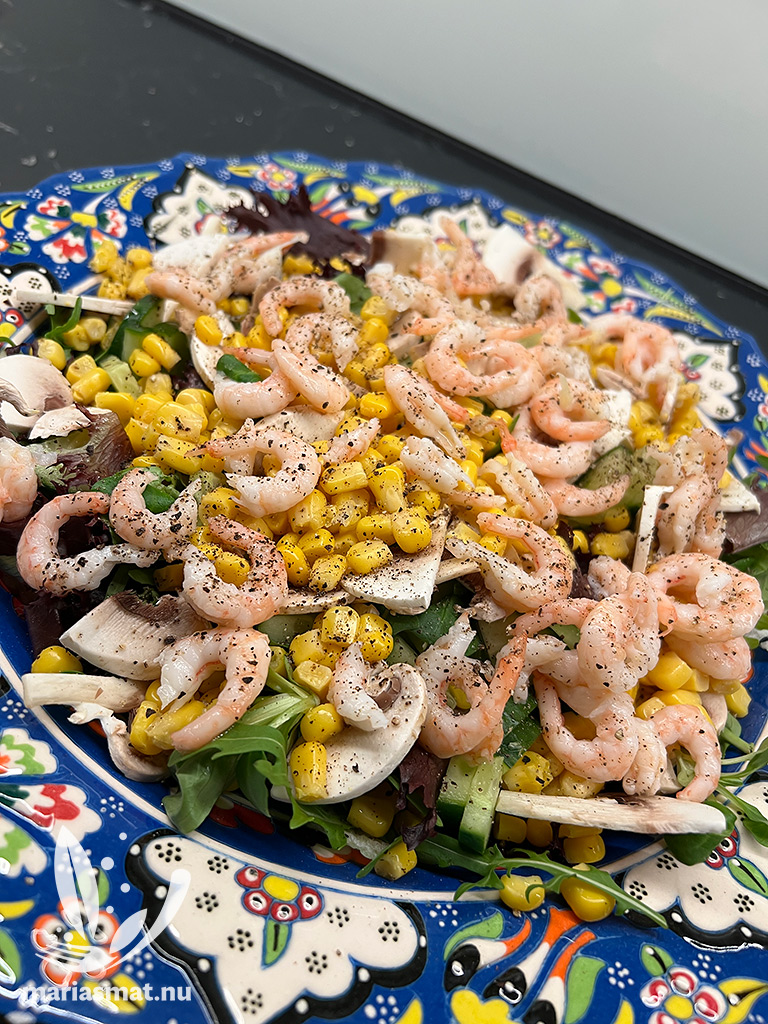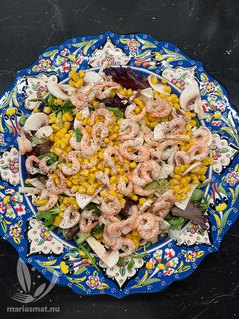 Ta fram ditt finaste fat och lägg ut blandad sallad. Själv tog jag isbergssallad och sen en blandsallad jag hittat i min butik. Fortsätt med delad gurka, skivade färska champinjoner och majs. Avsluta med att strö ut räkor jämnt över fatet och toppa med lite svartpeppar samt riven parmesan. Ställ fram fatet på bordet tillsammans med din hemmagjorda ceasardressing och jag lovar att alla blir nöjda.