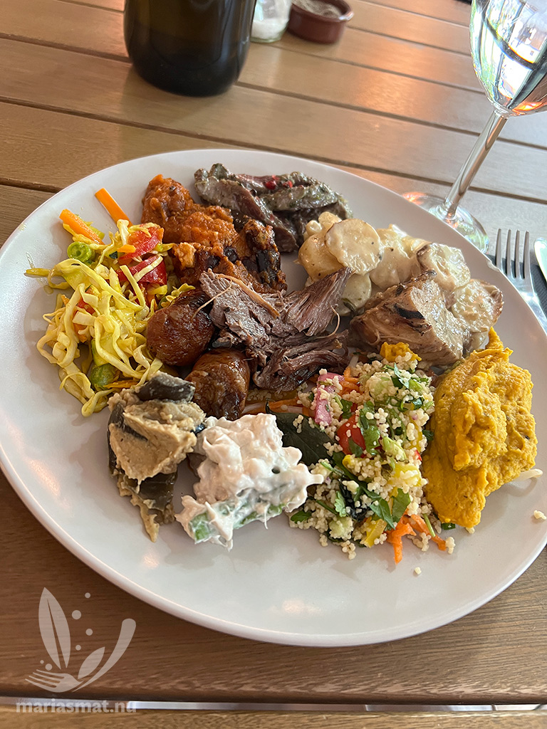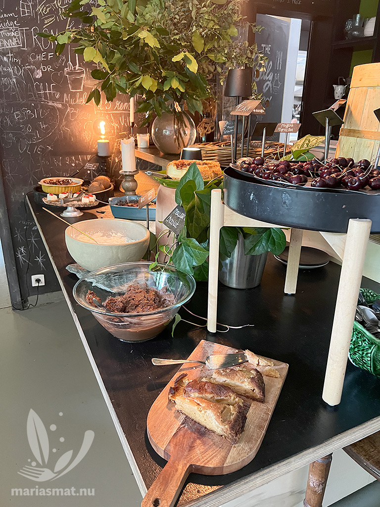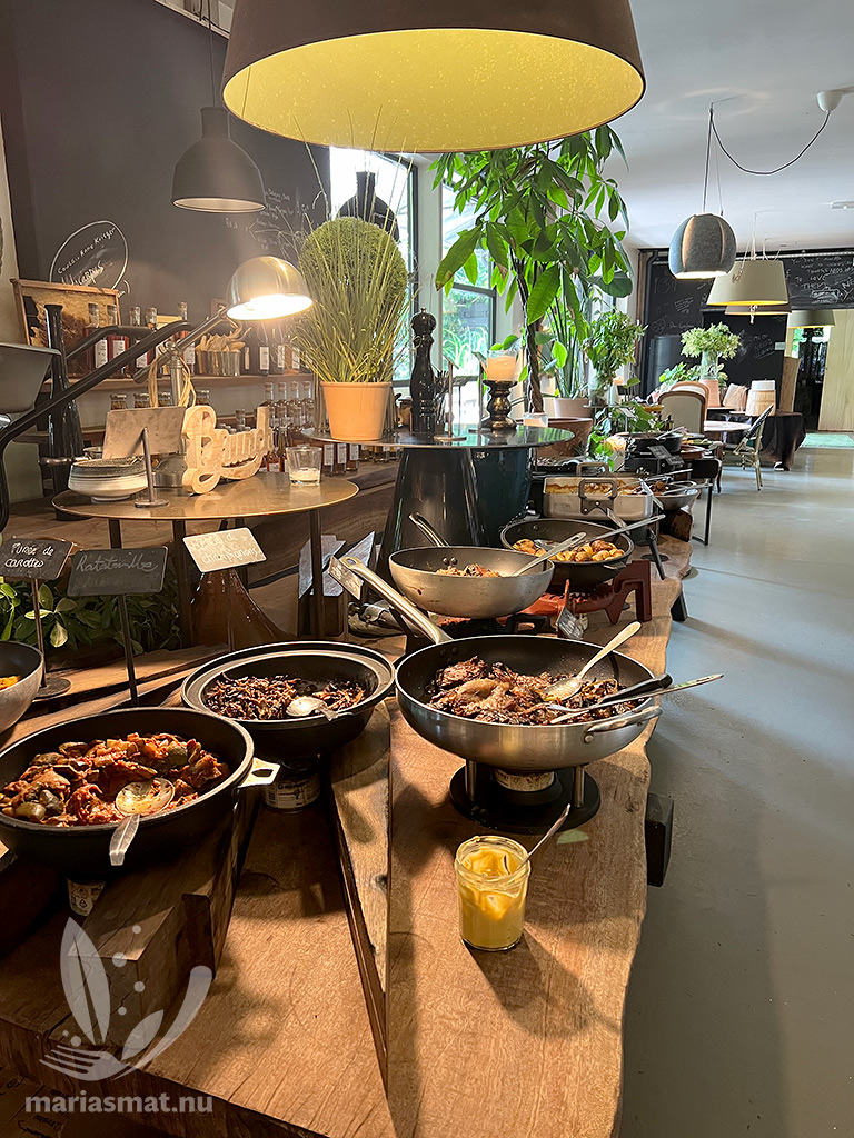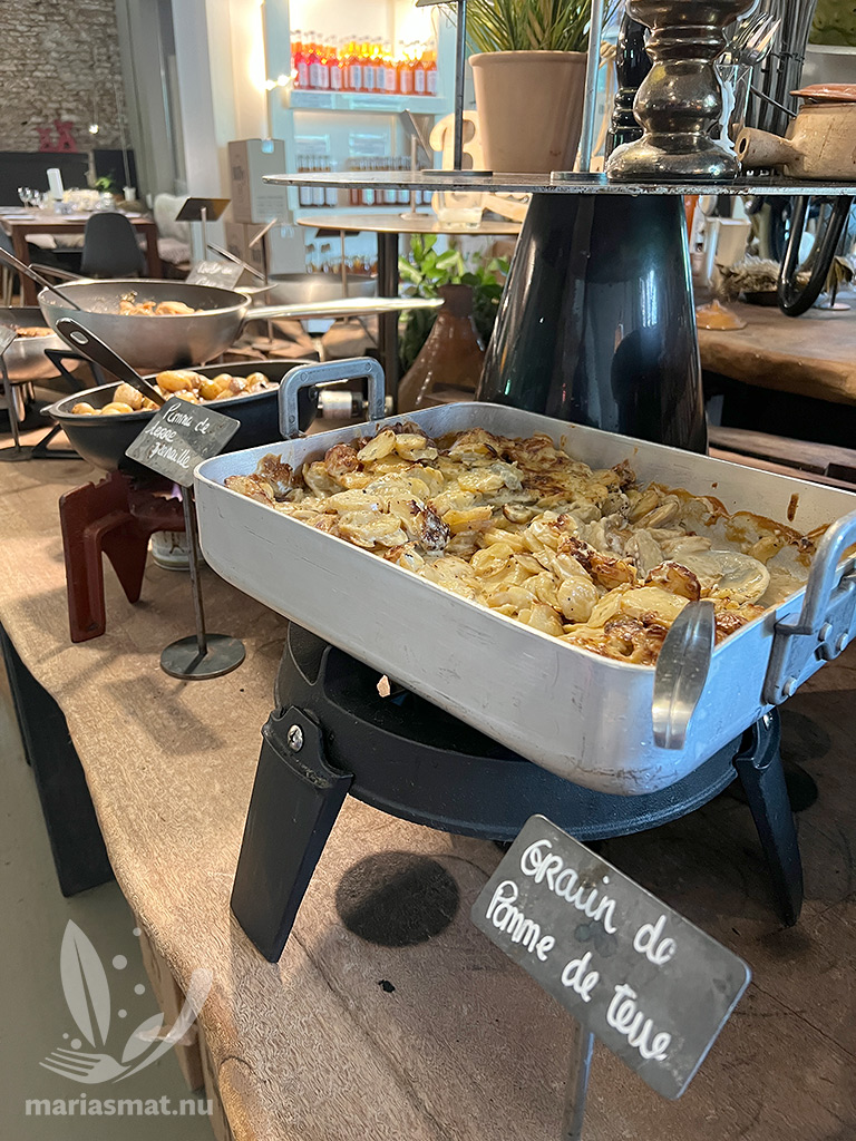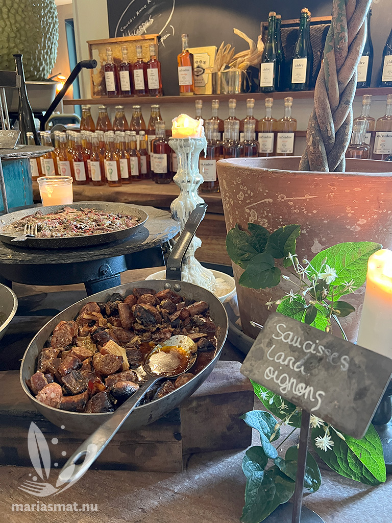 Men vi var inte klara med Farm Billy efter en Calvados-provning. Det var nämligen dags för lunch och då restaurangen erbjöd en lunchbuffé så slog vi till (pris 37€/pp 2025). Vi tog varsin tallrik och sen var det nästan så vi inte kom därifrån. All mat var otroligt vällagad och god, så det kan vara så att vi fick resans godaste mat på första stället.
