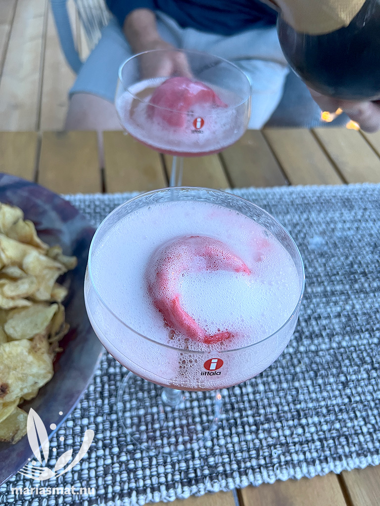 Det har varit lite paus från fredagsdrinkar här på bloggen ett tag, men det är svårt att ha med sig olika ingredienser på resande fot. Nu är vi hemma igen och vår inglasade balkong bjuder in till sköna (torra) kvällar bra länge till. Senast blev det hallonbubbel som fredagsdrink som vi festade på tillsammans med chips med skagenröra.
