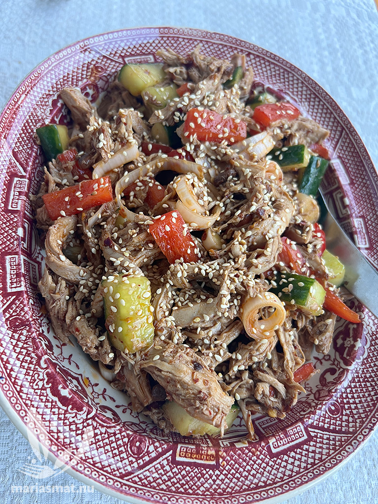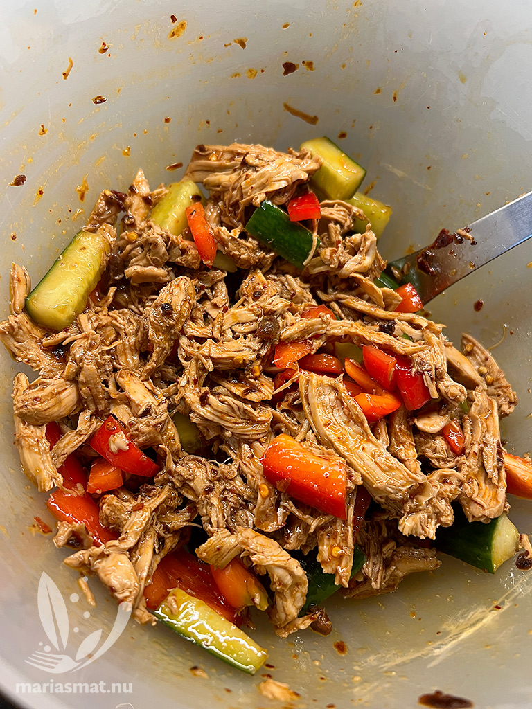 Skär upp gurka och paprika i bitar och lägg i samma skål som kycklingen. Häll såsen över både grönsaker och kyckling och blanda runt så såsen täcker alla delar. Låt allt stå medan du kokar riset och dukar bordet.