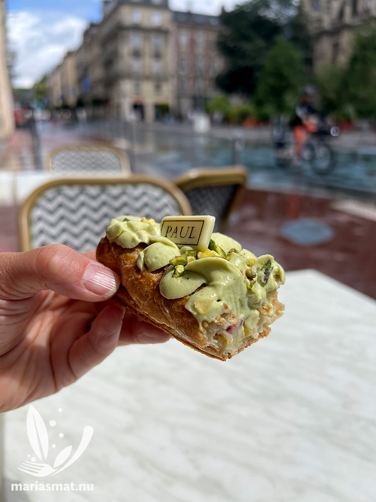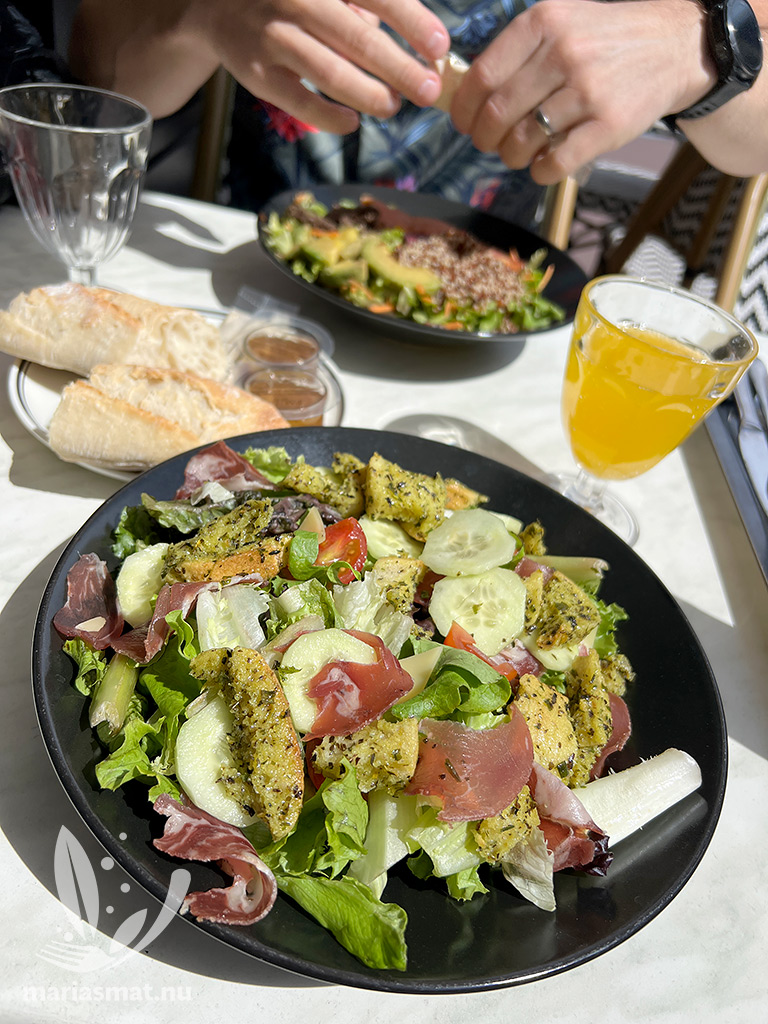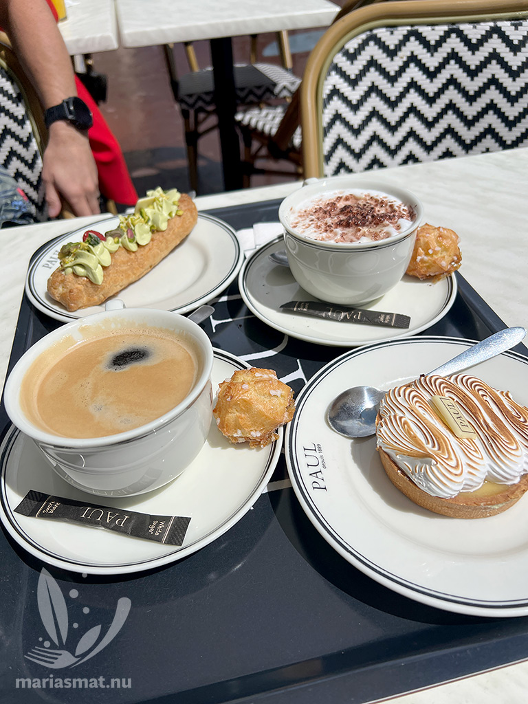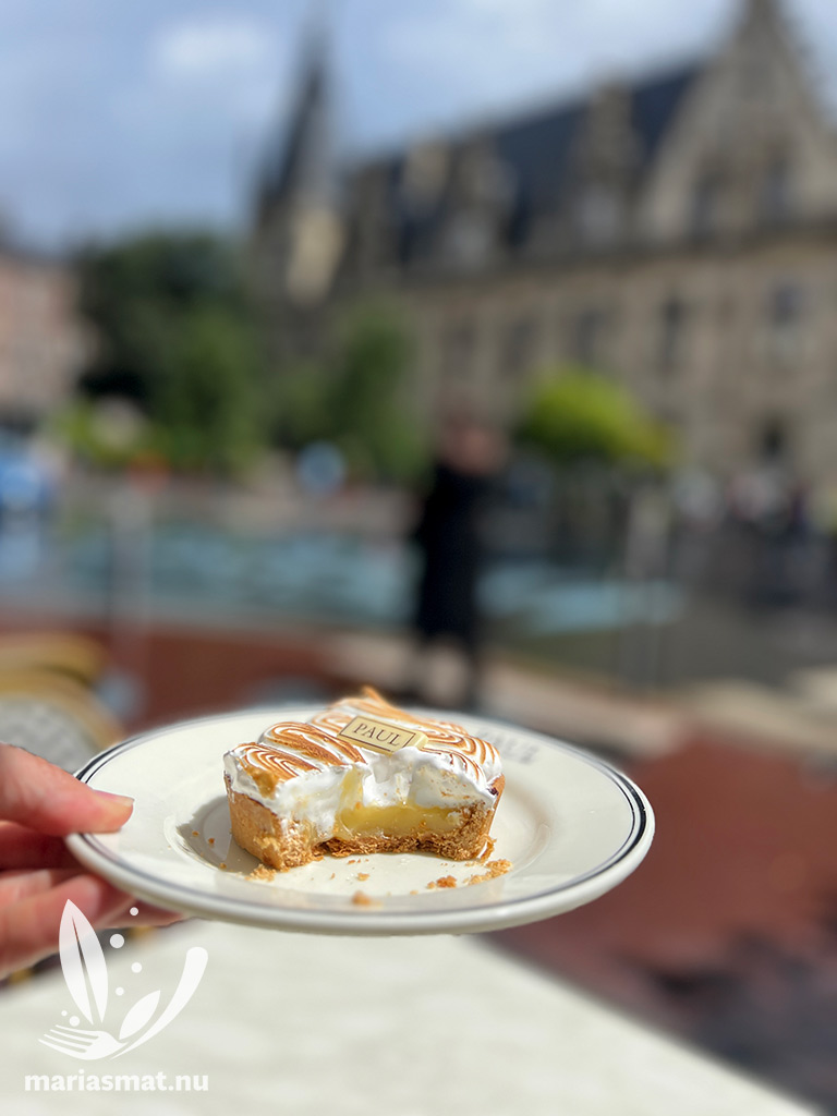 Sol och värme ibland och sen kom det en skur regn innan det blev sol igen. Men vi satt väldigt bra till och kunde äta vår lunch med dubbel-dessert i lugn och ro. Vi valde varsin sallad som var jättegod och helt rätt för oss båda denna dag. Sen ville vi ha varsin kaffe och jag ville testa deras Eclair. När jag stod och beställde min Eclair så tyckte jag också att citronmarängpajen såg otroligt god ut, så jag beställde in en sådan också. Daniel såg något förvånad ut när jag kom ut med vår dubbel-dessert till kaffet. Men hey – det klart att man måste testa franska bakverk när man väl är i Frankrike.