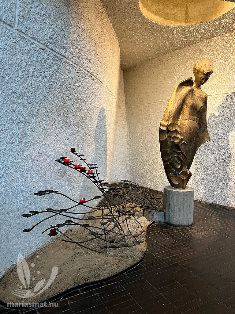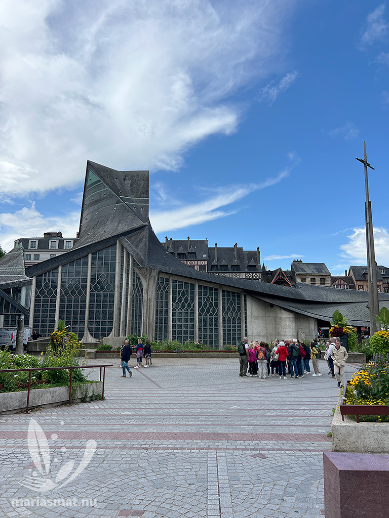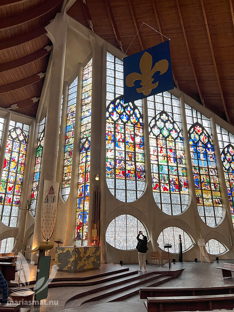 Vi var inne i den nya kyrkan och det mest slående är de vackra fönstren som täcker hela långsidan. De är daterade till 1520-1530 och skildrar olika scener ur Kristi och jungfru Marias liv. Från början satt de i kyrkan Saint-Vincent och när kyrkan förstördes fullständigt i de allierades bombräd i maj 1944 lyckades fönstren som ett mirakel räddas undan förstörelsen.