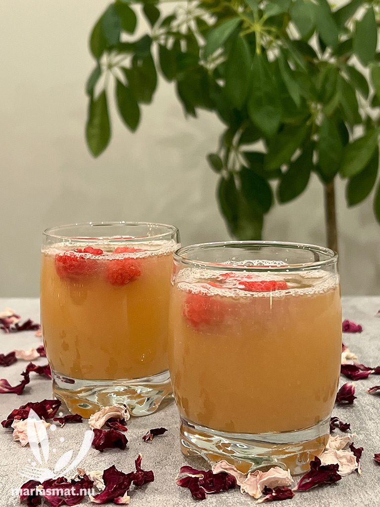 Blanda alla ingredienser (tom hallonen) i en shaker och skaka drinken kall. Häll upp i snygga glas och garnera med hallon.
