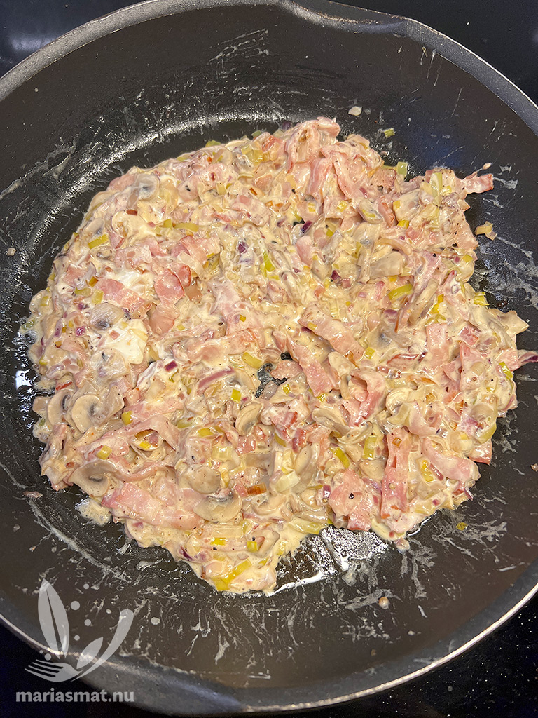 Börja med fyllningen. Hacka lök och vitlök samt skiva bacon och champinjonerna. Stek först bacon i en stekpanna och tillsätt sedan lök och champinjoner. Vitlöken får gå i sist och fräsa ca 1 minut. Tillsätt creme fraiche och ev färskost och låt allt puttra ihop. Smaksätt med salt & peppar.