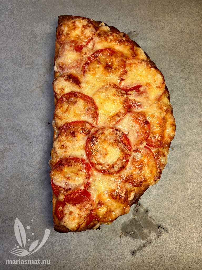 Sätt ugnen på 200 grader, ta fram en ugnsplåt med ett bakplåtspapper. Lägg ut en Hönökaka halvmåne och lägg sedan på ca 1/3 av fyllningen på det brödet. Lägg på nästa Hönökaka och lägg på nästa 1/3 fyllning och toppa med det sista brödet. Lägg på det sista av fyllningen och avsluta med skivade färska tomater samt riven ost.