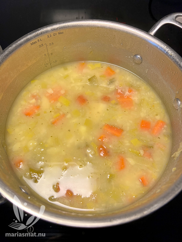 Börja med potatisarna. Skala dem och skär i mindre bitar. Lägg ner i vattnet och sätt igång för kokning. Under tiden hinner du skala eller skrubba morötter och palsternackor (det gör inget om skalet är kvar bara du skrubbat – det är där nyttigheterna sitter).