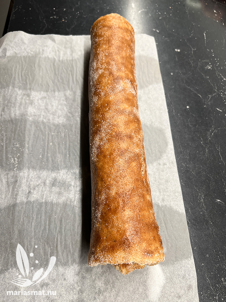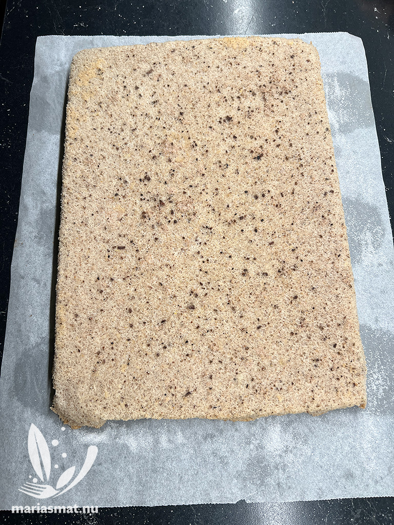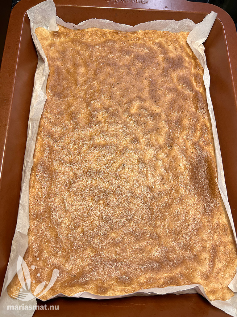 Stjälp rulltårtan upp och ner på ett bakplåtspapper med socker på. Låt svalna en aning men inte för mycket. Den är lättare att rulla ihop om den fortfarande är lite ljummen – men inte så varm så smöret smälter.
