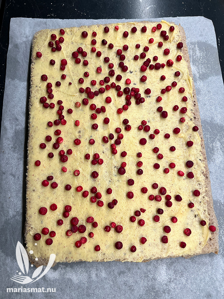 Ta fram smöret en stund i förväg, det är lättare att blanda om smöret är mjukt. Vispa samman alla ingredienserna till en fluffig smet och bred den över rulltårtan. Toppa eventuellt med lingon.