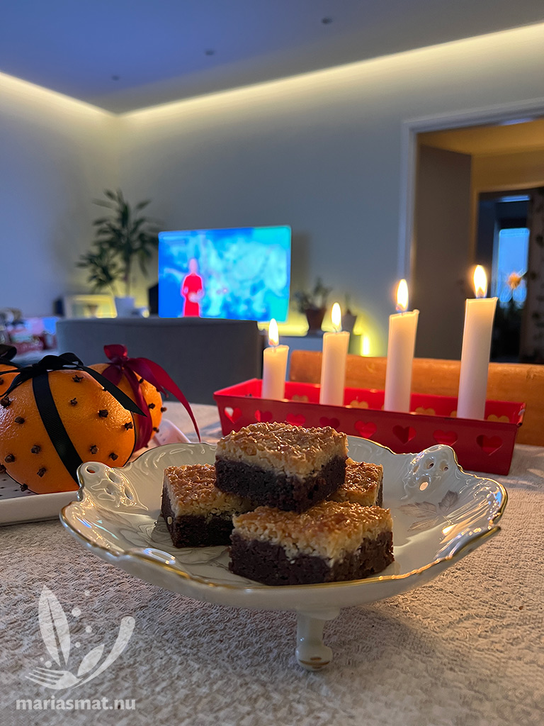 Ta ut och låt den svalna. Skär kakan i rutor med en vass kniv och servera dessa urgoda kokostoscarutor med polkagris till fjärde advents fika (och det är en så stor kaka – och man orkar bara äta mindre bitar – så den räcker till julafton också. Perfekt va?)
