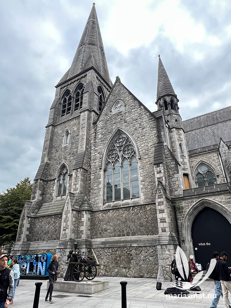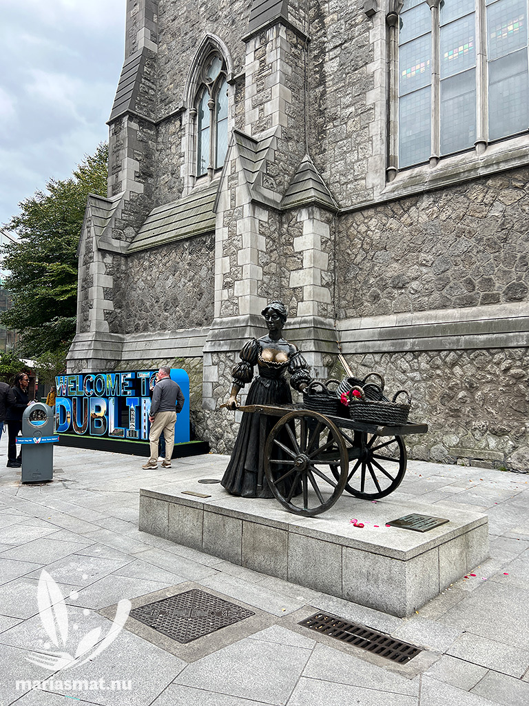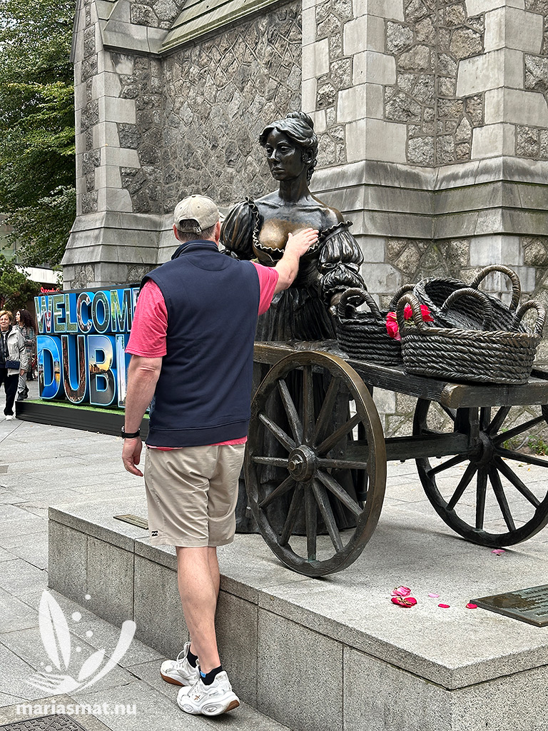 När vi var i Dublin i slutet av september förra året, så råkade jag se Mollys namn på en karta och vi gick till korsningen St Andrew’s/Suffolk Street/Church Ln för att se henne. Hennes bronsstaty står utanför St Andrew’s church (en kort promenad från Trinity Collage och Grafton Street) där vi även hittade en stadsskylt som vi fotograferade oss framför.