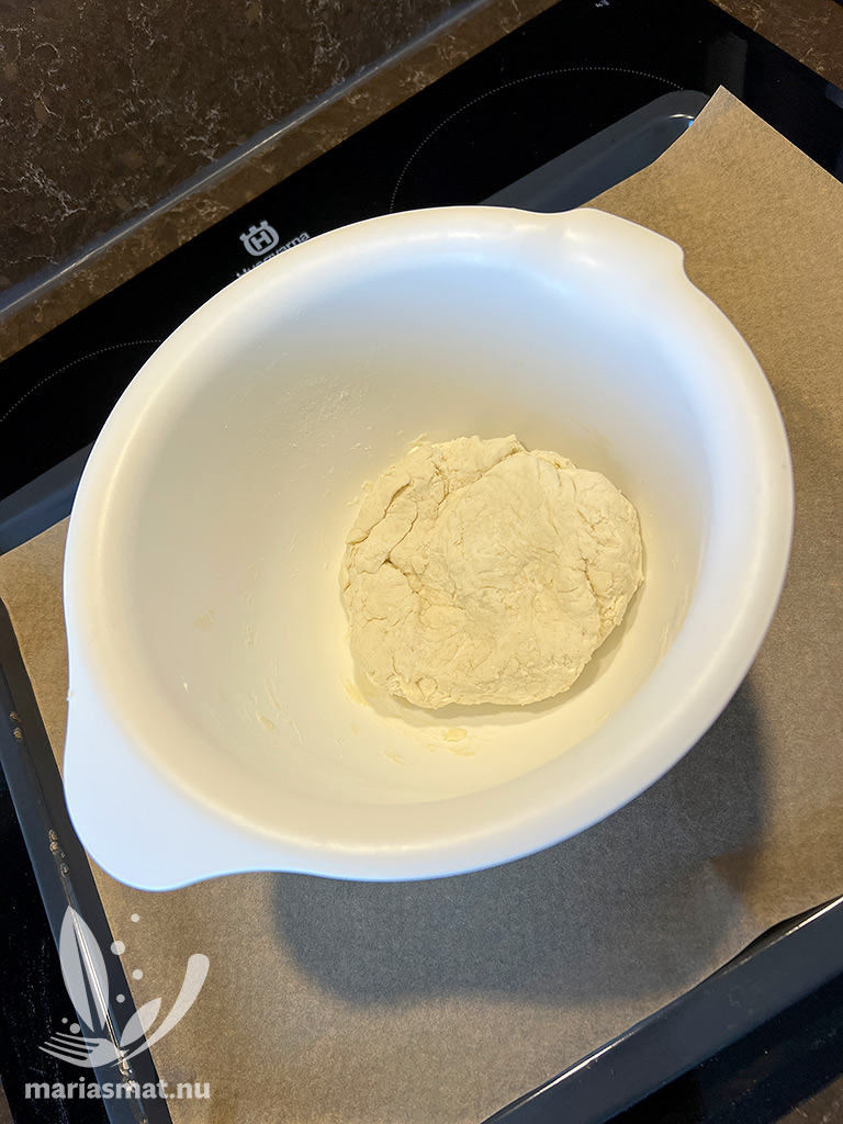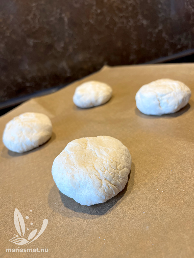 Sätt ugnen på 200 grader och ta fram en plåt med bakplåtspapper. Mät upp ingredienserna i en skål och knåda ihop till en deg (först jobbade jag med en slev men jag fick gå över till att knåda det sista med händerna).