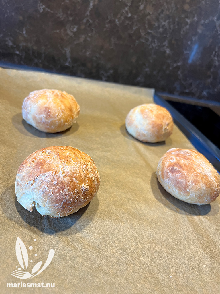 Dela degen i fyra lika stora delar och rulla dem till bollar. Platta till dem en aning och lägg ut på bakplåtspapper. Sätt in i ugnen ca 20-25 min. Ta ut plåten och låt frallorna svalna en aning – men inte för länge. Varma, nybakade bröd till frukost kan vara bland det godaste som finns!