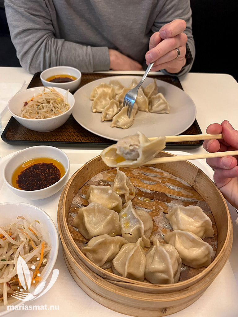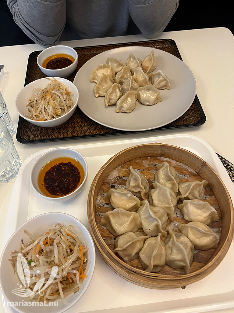 Vi var båda sugna på dumplings denna dag. Så vi valde 12 dumplings, med tre olika smaker. Fyra st fläsk och salladslök, fyra st kyckling och majs samt fyra st nötkött – allt för 129 kr/portion. De ena var ångkokta och de andra var stekta – och så delade vi och fick hälften var. Det kanske inte ser så mycket ut, men jag stod mig bra hela eftermiddagen.