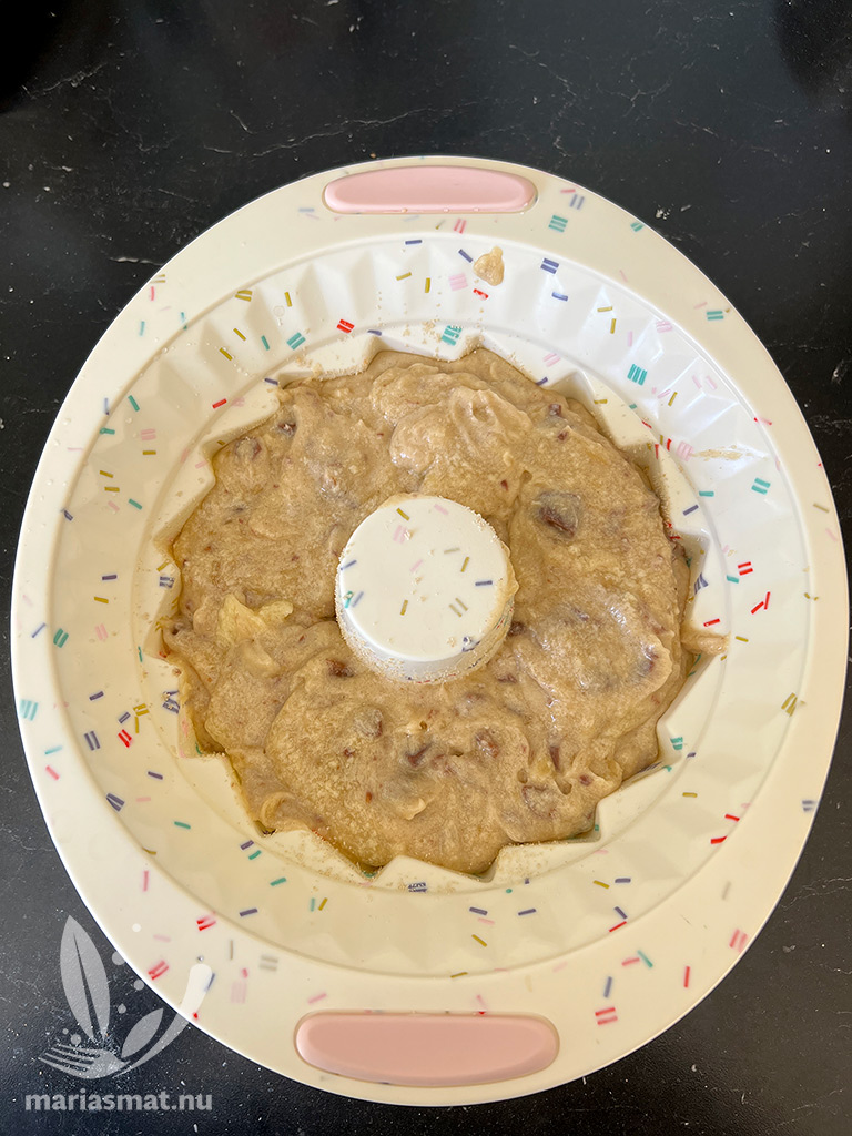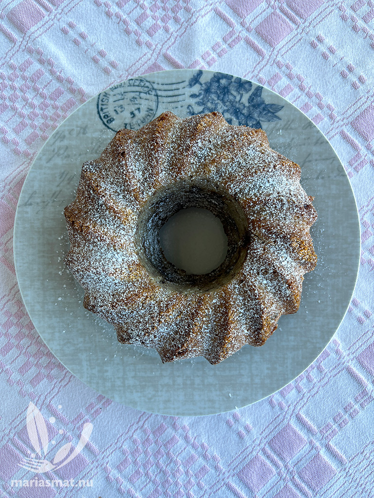 Grädda mitt i ugnen i ca 30-35 min (eller 45-55 min i en silikonform). Stick med en potatissticka så du ser att kakan är klar.