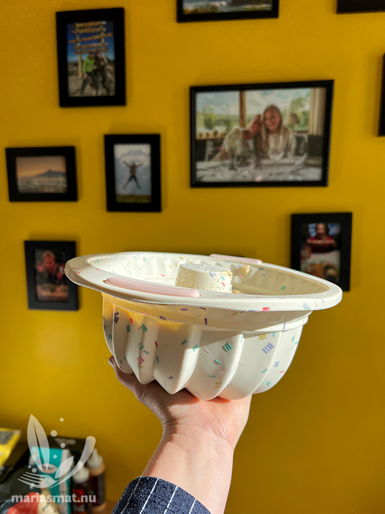 Det man ska veta om silikon är att det funkar jättebra i värme, det leder i princip ingen värme alls. Det betyder att du nästan kan ta i din silikonform utan ugnsvantar (men ta det ändå så du inte bränner dig!) Tyvärr så får det effekter som inte en vanlig sockerkaksform har. Jag hade inte läst på utan tänkte att ”det ska väl funka som vanligt”. Satte in formen i ugnen och planerade att sticka ut på min dagliga löprunda då kakan skulle vara klar efter 30-35 min.