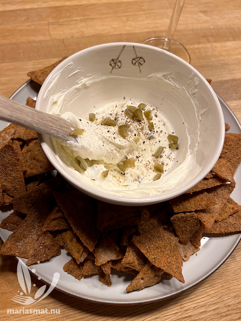 Vi testade bara med Finn Crisp och deras trekantschips och det passade väldigt bra. Nästa gång kanske jag ställer fram hälften sådana och hälften vanliga chips – det går ju också att ställa fram gott smörstekt bröd i mindre bitar. Välj vad som passar er bäst!