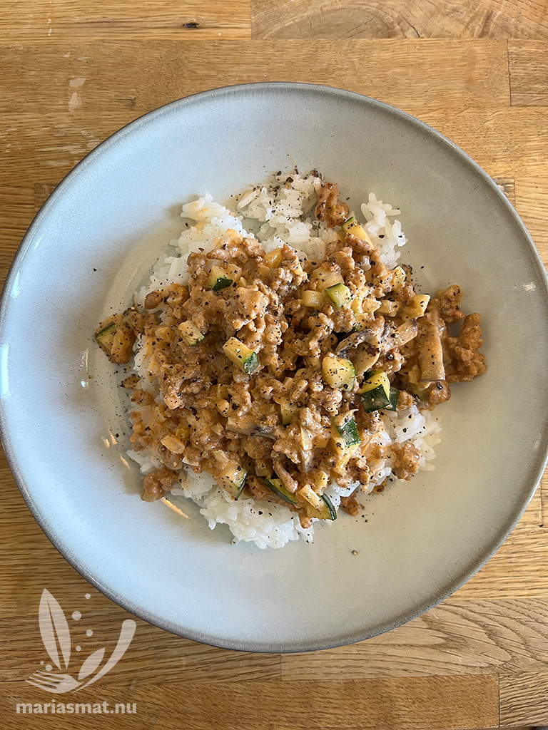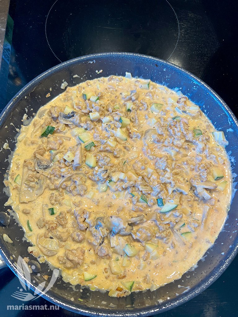 Börja med att steka chorizofärsen ifall du inte gjort det tidigare. Ta ur färsen och lägg ner hackad lök, zucchini i mindre tärningar och skivade champinjoner. Låt fräsa några minuter innan du lägger ner färsen igen. Fortsätt med en skvätt grädde samt creme fraiche och låt allt puttra ihop.