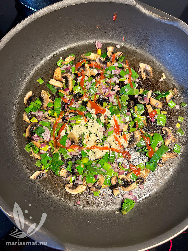 Starta en pastakastrull. Hacka lök, purjolök, vitlök och champinjoner. Börja steka lök och purjolök. Tillsätt vitlök, champinjoner och chili och låt steka i ca 1 minut.