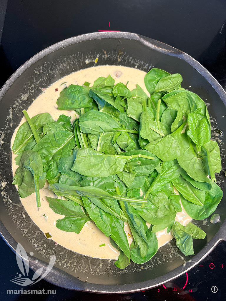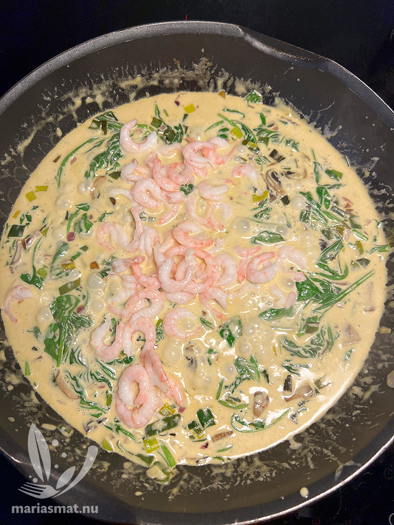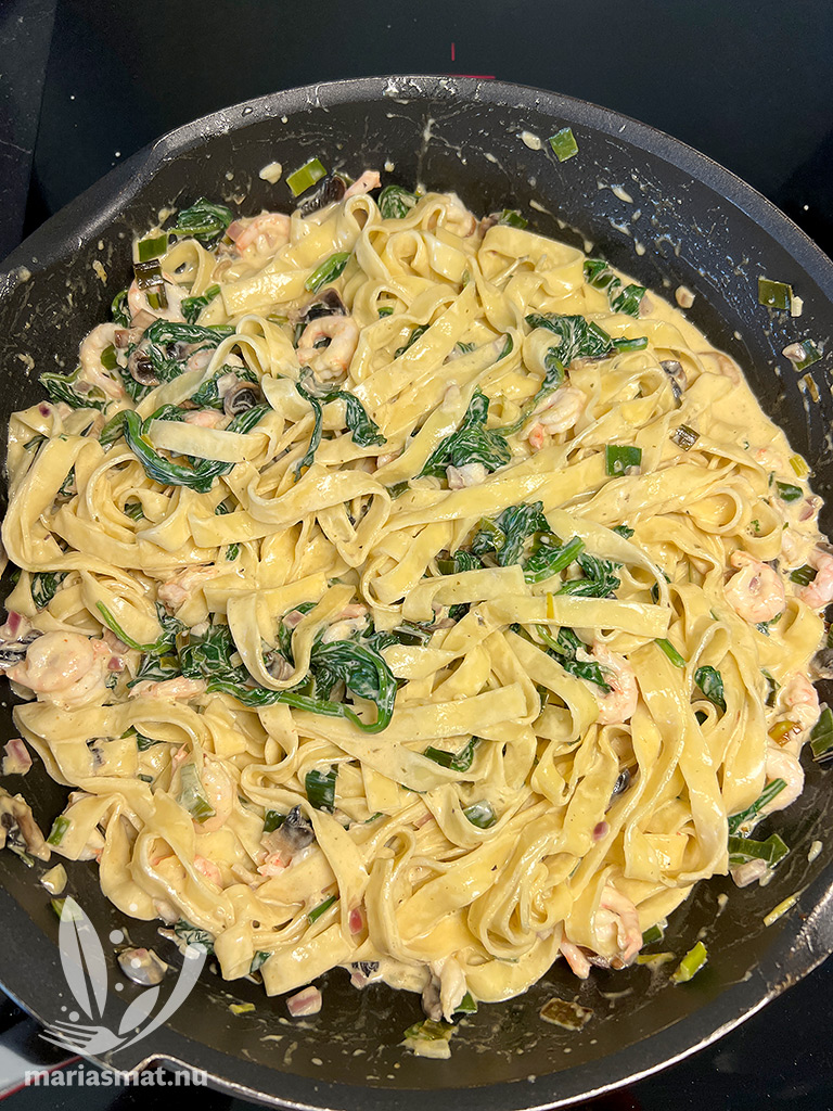 Tillsätt grädde, creme fraiche, pesto samt färsk spenat och låt allt puttra ihop. Smaksätt med salt & peppar. När pastan kokat klart, häll av – spara lite pastavatten – och häll ner pastan i stekpannan tillsammans med räkor. Blanda om, så all pasta får lite av pastasåsen. Om du upplever att det är för lite pastasås, tillsätt lite av pastavattnet.