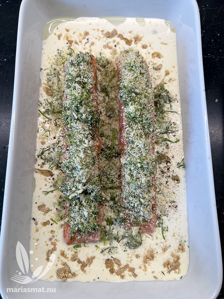 Blanda ihop hackad dill, riven parmesan och ströbröd. Tillsätt sedan zest och saft från 0,5 lime. Blanda ihop och lägg sedan ut smulet ovanpå laxen och sätt in i ugnen. Gärna tillsammans med en ugnstermometer, så du kan se när laxen är ca 54-56 grader.