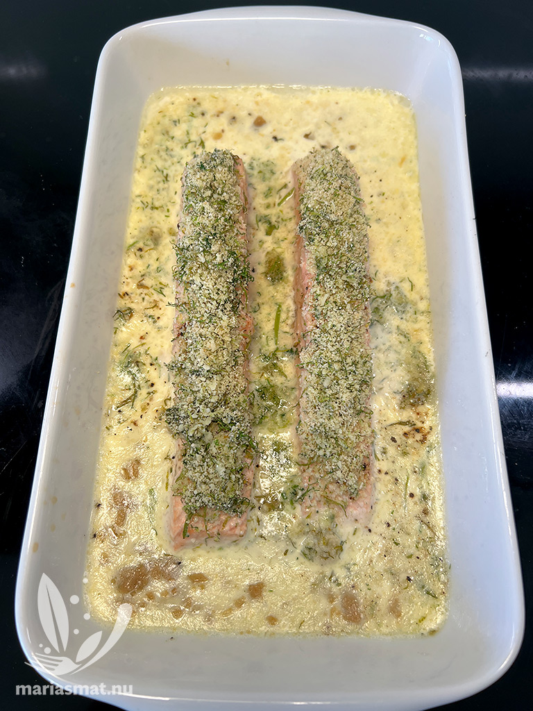 Sätt ugnen på 150 grader. Ta fram en ugnsform och lägg laxbitarna däri, med skinnet neråt. Blanda ihop grädde, mjölk och buljongtärning i en kastrull och värm såpass att buljongtärningen smälter (det gjorde inte jag utan smulade buljongtärningen runt – men det blir nog bättre om allt får smälta ihop). Häll vätskan runt om laxen.